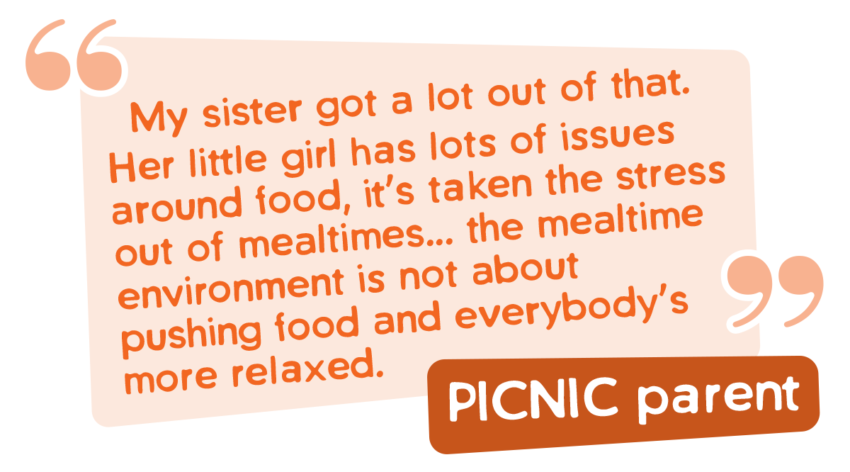 Our PICNIC parents say not pressuring their children to eat was the feeding practice they most needed to change. Some parents found it really hard to stop pressuring initially, especially if their children were a bit older and they had been doing it for a while. They were really glad when they stopped the pressure.