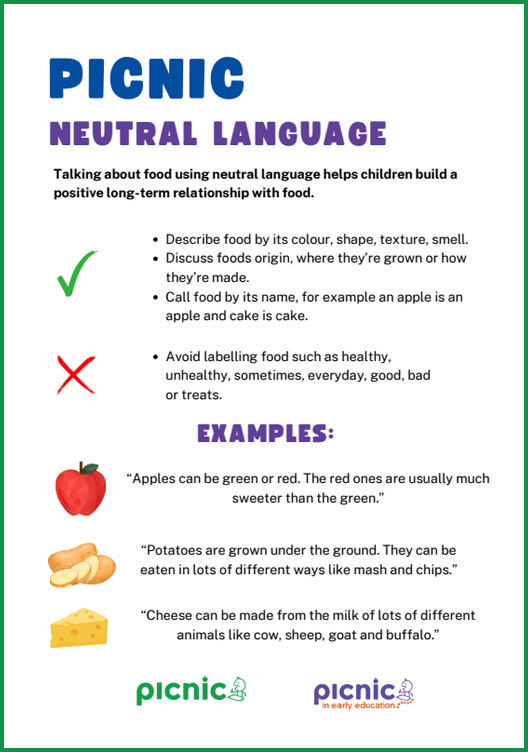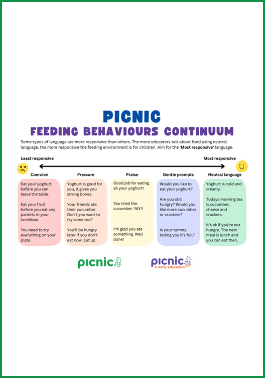 As part of PICNIC in Early Education, we have developed a suit of resources to help implement evidence-based feeding practices within your centre, including: